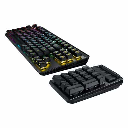 The ASUS ROG Claymore II is the ultimate elite-gaming keyboard. Slide the magnetic numpad onto either side—or remove it entirely—to switch between 100% layout and TKL mode. Choose wired USB-C, lag-free 2.4 GHz wireless, or turn off the lights for marathon 144-hour battery life. Built on per-key Aura Sync RGB, PBT doubleshot keycaps, and ultra-durable ROG RX Optical Mechanical switches, Claymore II adapts to your play style.