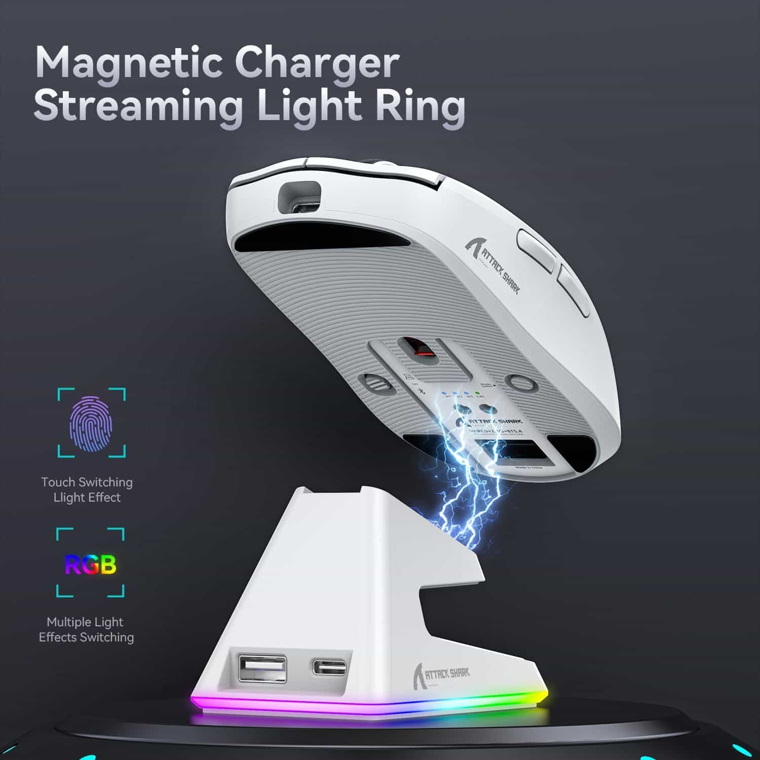 Never run out of power in the middle of a session. The included magnetic charging dock provides fast and secure recharging. Touch sensor on the dock lets you toggle RGB effects with ease.
