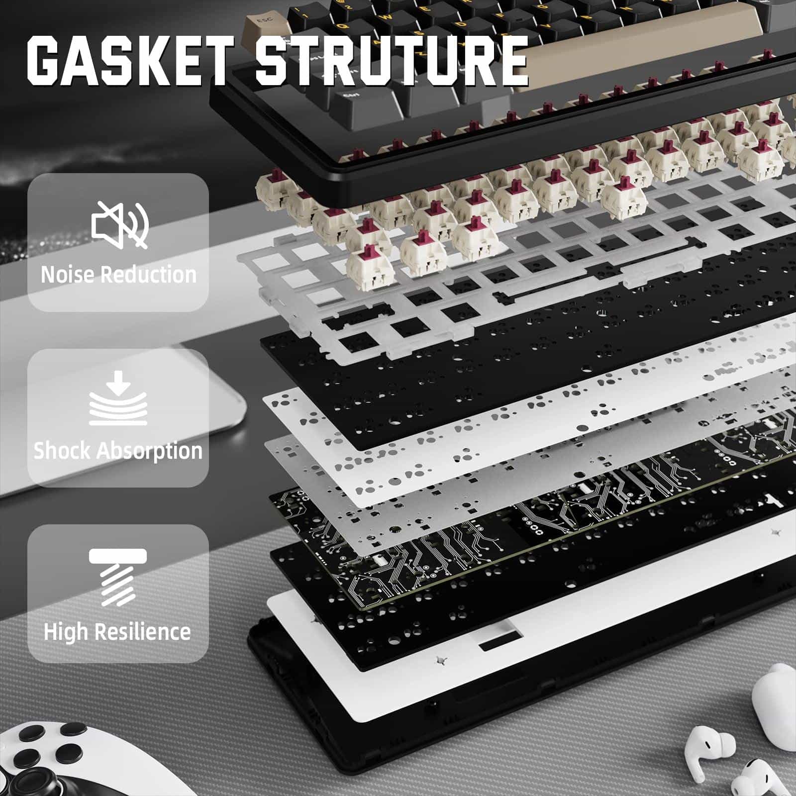 Designed with a soft-leaf spring gasket and five layers of foam insulation (PORON, IXPE, PET), this board ensures an ultra-refined typing feel and a creamy acoustic profile that reduces bottom-out noise and case ping.