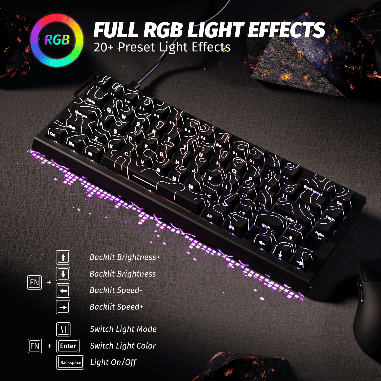 Features side-printed PBT double-shot keycaps with shine-through legends and electromagnetic wave pattern. Customize your RGB backlighting with 20+ effects and 9 color options through the easy-to-use web driver interface.