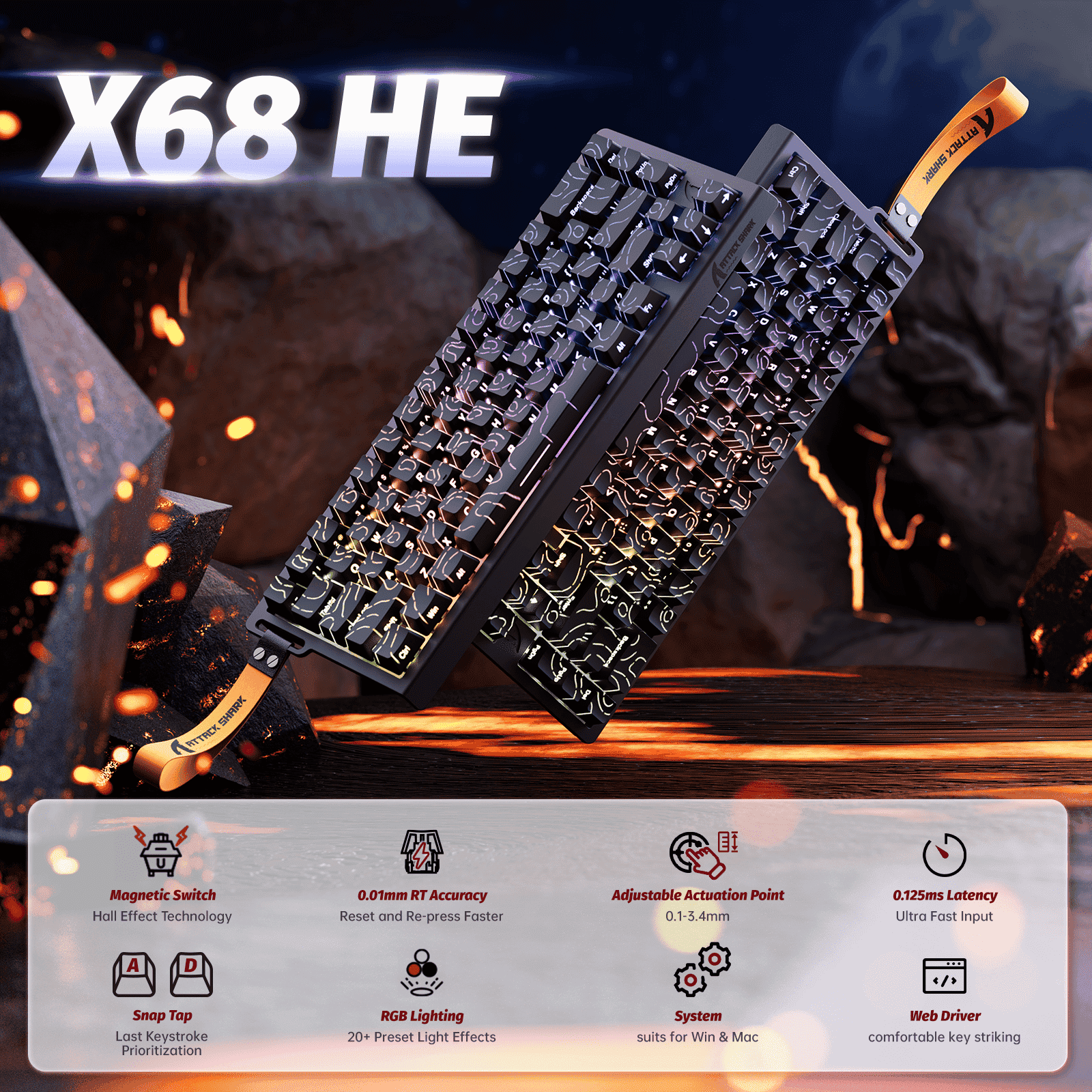 The ATTACK SHARK X68 HE is a revolutionary 60% wired gaming keyboard equipped with magnetic linear switches, delivering ultra-fast actuation and full per-key customization. Built for speed, control, and versatility, it gives you an edge in high-stakes gameplay.