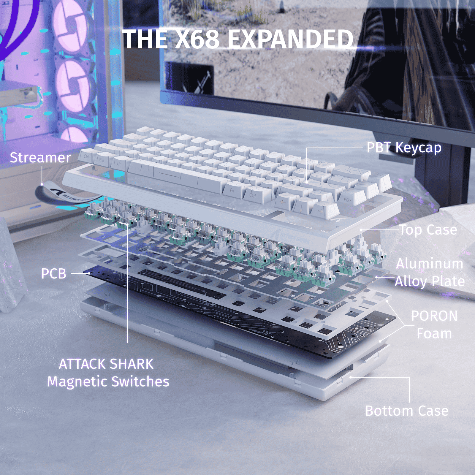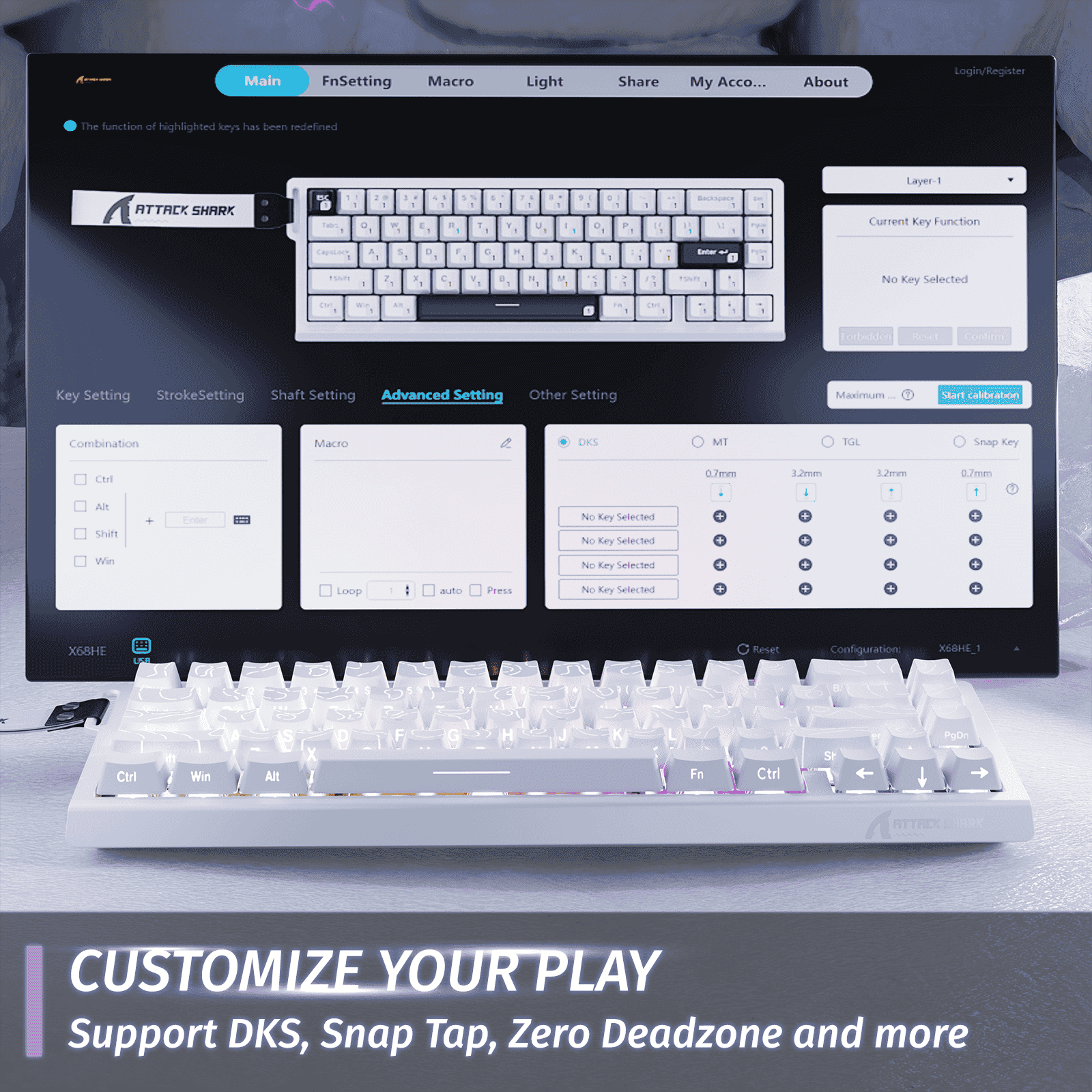 Every keystroke is registered with precision thanks to adjustable actuation points from 0.1mm to 3.4mm. Whether you want hair-trigger response or deliberate typing control, the X68 HE lets you tune each key to your style with 0.01mm sensitivity.