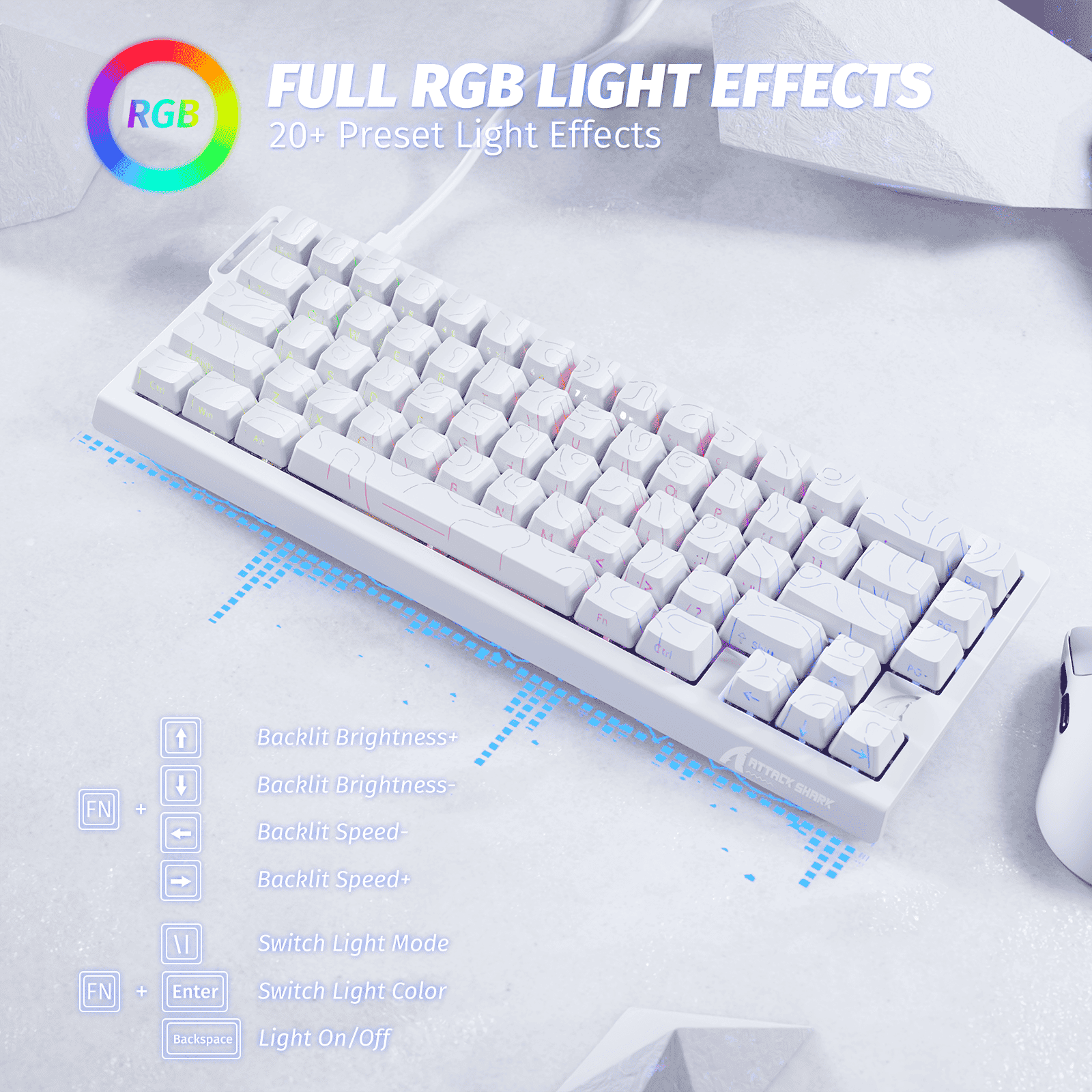 Features side-printed PBT double-shot keycaps with shine-through legends and electromagnetic wave pattern. Customize your RGB backlighting with 20+ effects and 9 color options through the easy-to-use web driver interface.