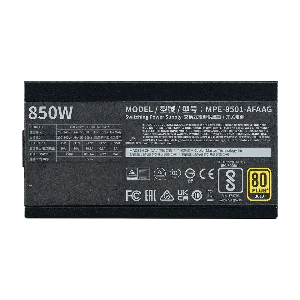 The Cooler Master MPE-8501-AFAAG-3EU 850W Power Supply offers reliable power with 80+ Bronze certification, ensuring efficient energy use. Built for quiet and efficient cooling, it is equipped with high-quality components and advanced protection features, making it an ideal choice for mid-range to high-performance PC builds.