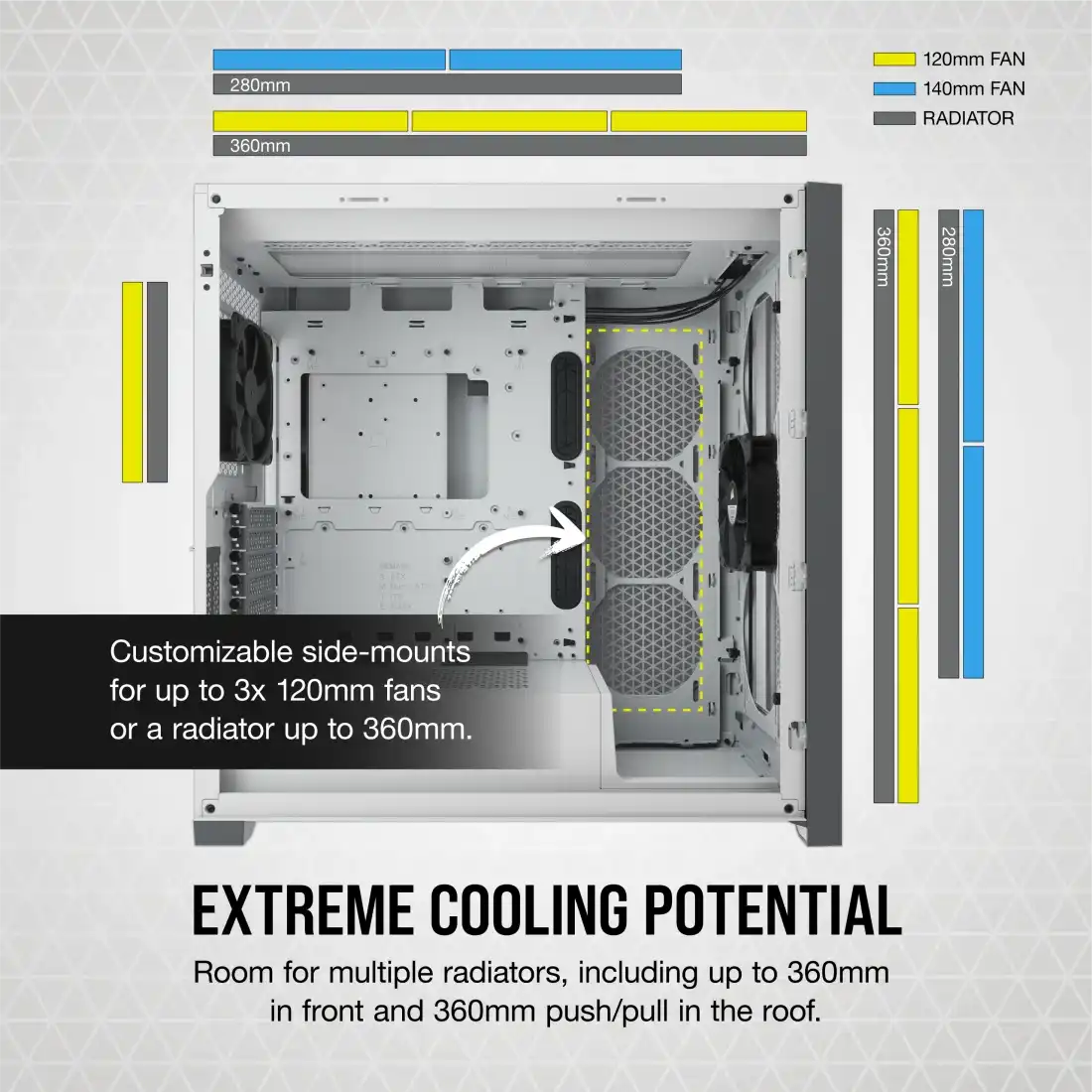• Spacious Interior: Accommodates up to 10x 120mm or 4x 140mm cooling fans, along with multiple radiators including up to a 360mm in front or side and a 360mm push/pull in the roof.
