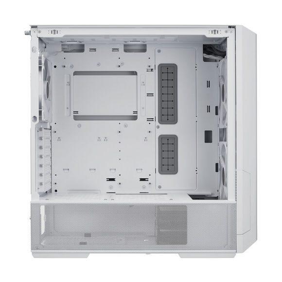 The case features a minimalist white aesthetic with a mesh front panel for maximum air intake. It combines durability with elegance, making it an excellent centerpiece for any high-performance PC setup.