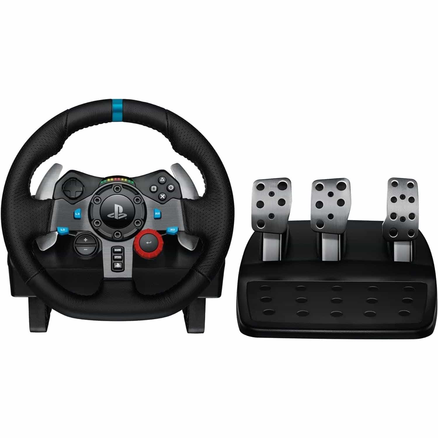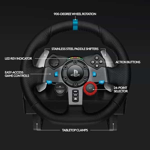 The Logitech G29 Driving Force racing wheel delivers realistic 900° rotation, dual-motor force feedback, and hand-stitched leather grip—complete with a responsive three-pedal set and stainless-steel paddle shifters for immersive sim-racing.