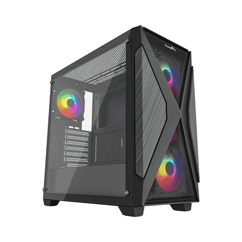 The Thunder Diesel TGC-684 ATX Gaming Case is a sleek and spacious chassis designed for high-performance gaming builds. It supports E-ATX, M-ATX, and Mini-ITX motherboards, with ample room for cooling and storage. Pre-installed with three 120mm ARGB fans, it offers customizable lighting and excellent airflow. The case supports up to three 120mm front fans, one rear fan, and three top-mounted fans, ensuring optimal cooling. It also features space for two 3.5″ HDDs and two 2.5″ SSDs. Dimensions: 434(L) x 218(W) x 454(H) mm.